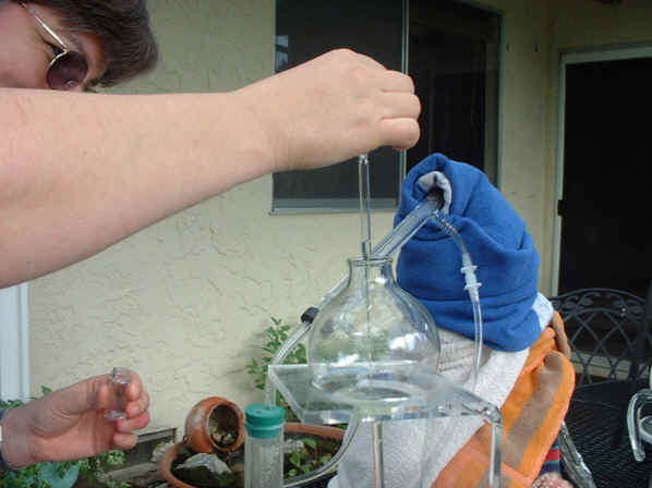 The water is then carefully poured into this flask with the narrow draining neck in the bottom. After letting the water sit for awhile to allow the oil to separate out, the narrow tube is opened where the hydrosol is allowed to drain. When the Essential Oil enters the narrow tube, it is then shut off so the Essential oil can be drawn off.